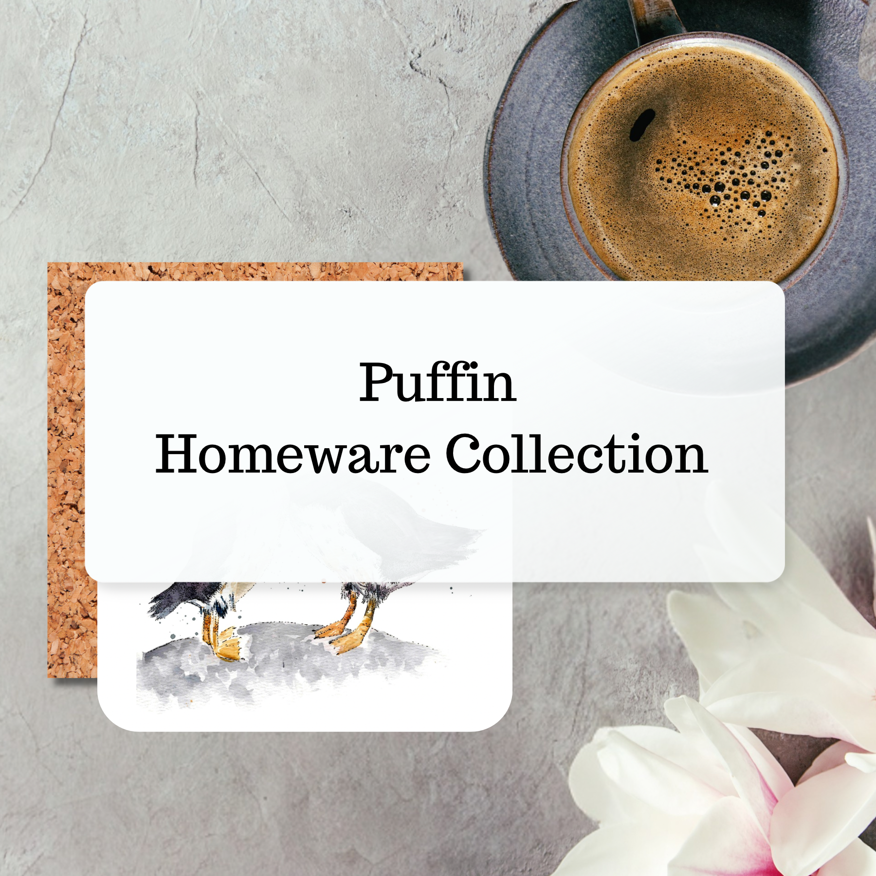 Delightful puffin homeware celebrating these iconic seabirds through soft watercolour and detailed ink illustrations. Designed to bring a relaxed coastal charm into your home.
