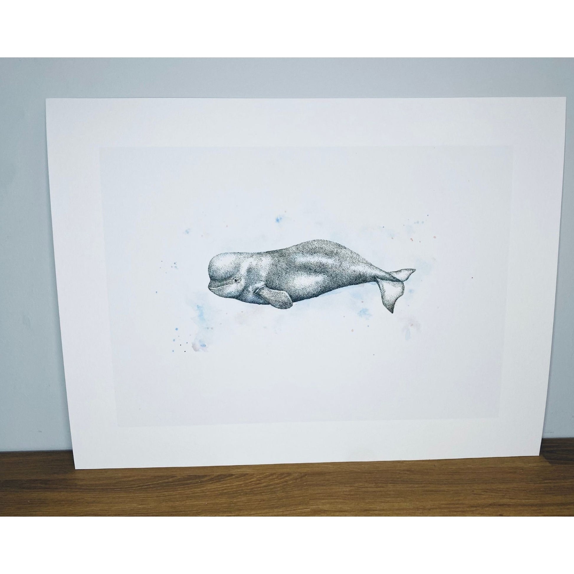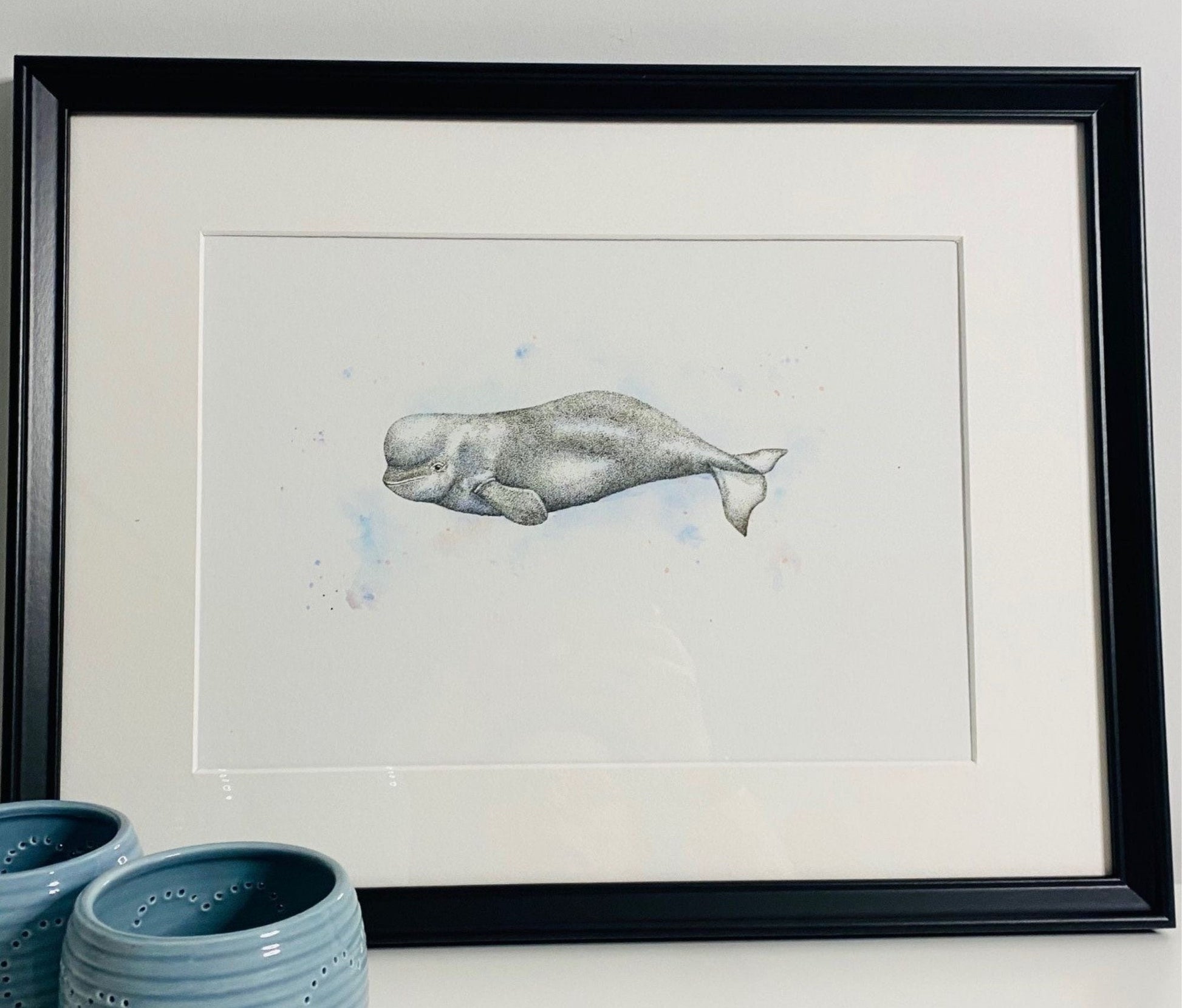 A Beluga Whale Original watercolour and ink art. This depiction of a Beluga whale swimming in the sea is a fantastic image of this beautiful creatures majestic grace.