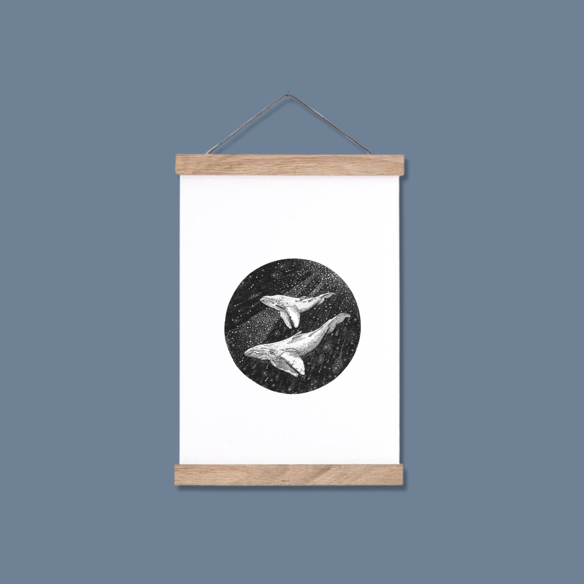 The monochrome palette enhances the intricate patterns, making it an eye-catching piece for any room. Whether you're looking to add a touch of nature to your living space or searching for a meaningful gift, this whale and calf art print is a timeless choice.