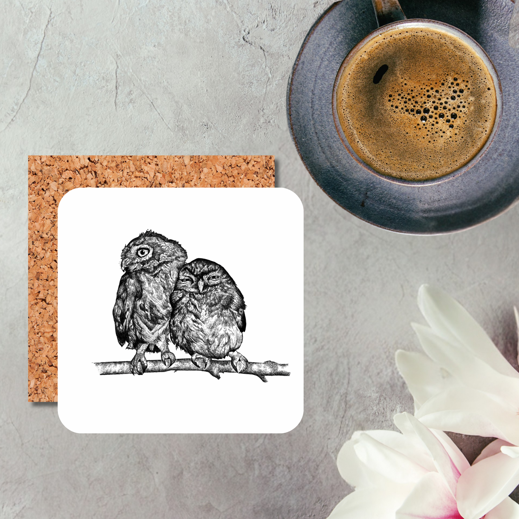 Black & White Owls Cuddling Coaster