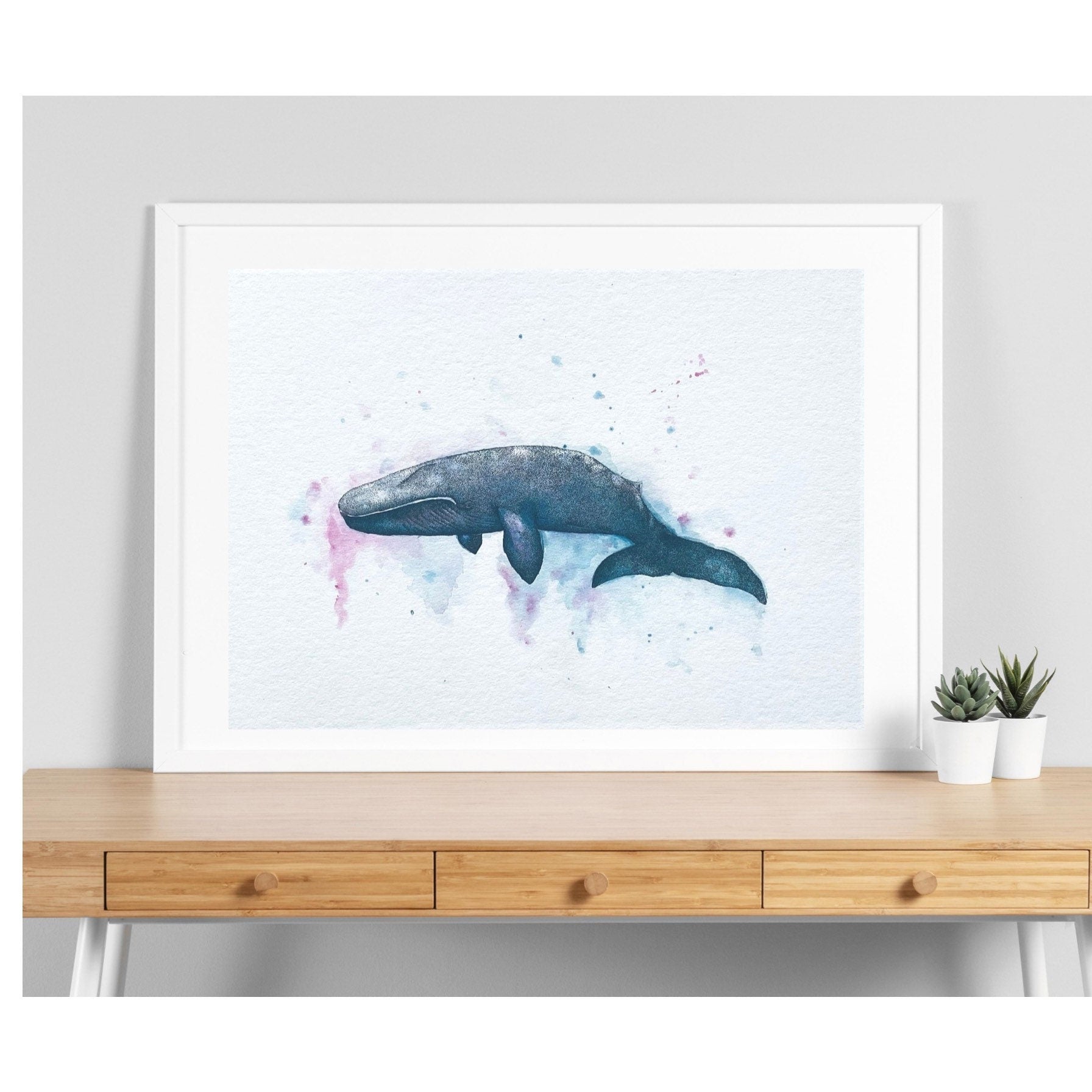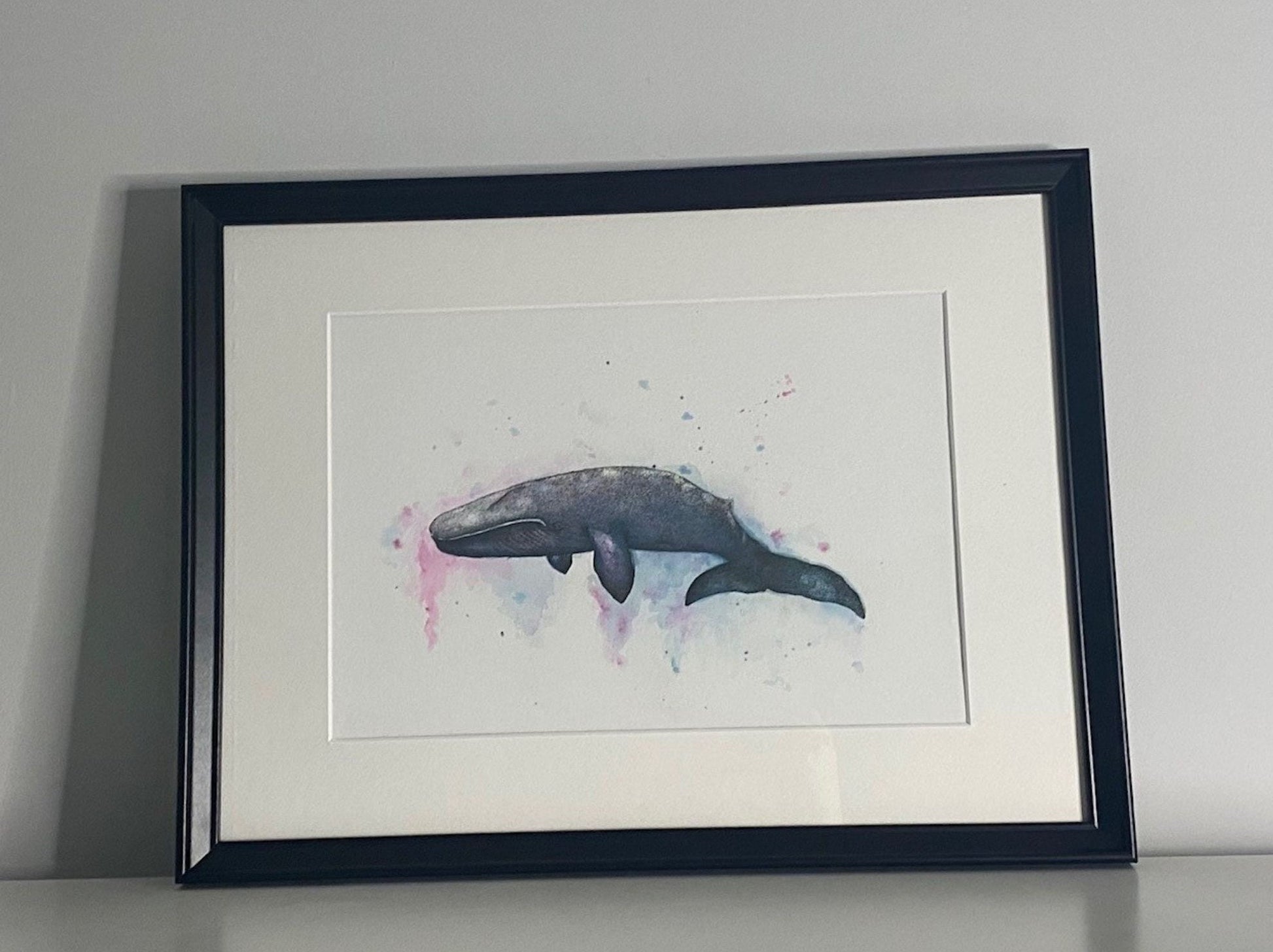 A Blue Whale watercolour and ink original art piece. This original piece of a Blue Whale swimming in the sea is a fantastic image of this beautiful creatures majestic grace.