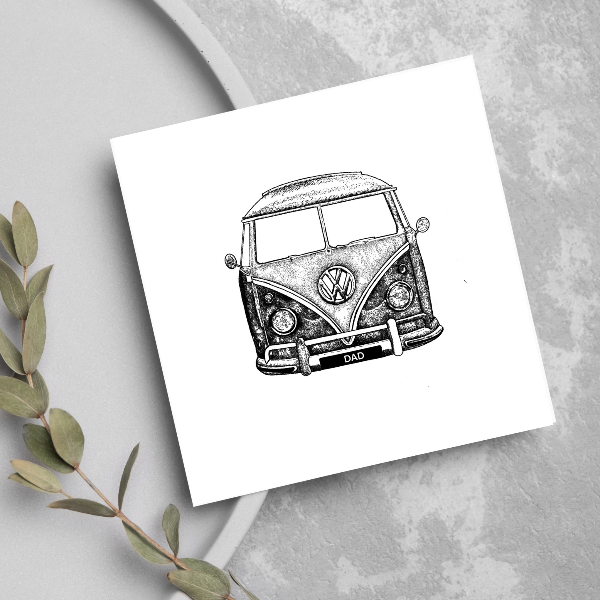 Celebrate the special dad in your life with our unique and charming greeting card, featuring a classic black and white Volkswagen van illustration. This card is perfect for Father's Day, birthdays, or just to show your appreciation.
