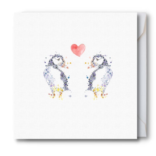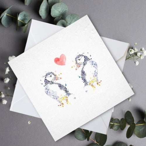 This unique design features two adorable puffins, hand-painted in vibrant watercolour, standing on a crisp white background with a delicate love heart between them. Perfect for birthdays, anniversaries, or any occasion that celebrates love, friendship, or connection.