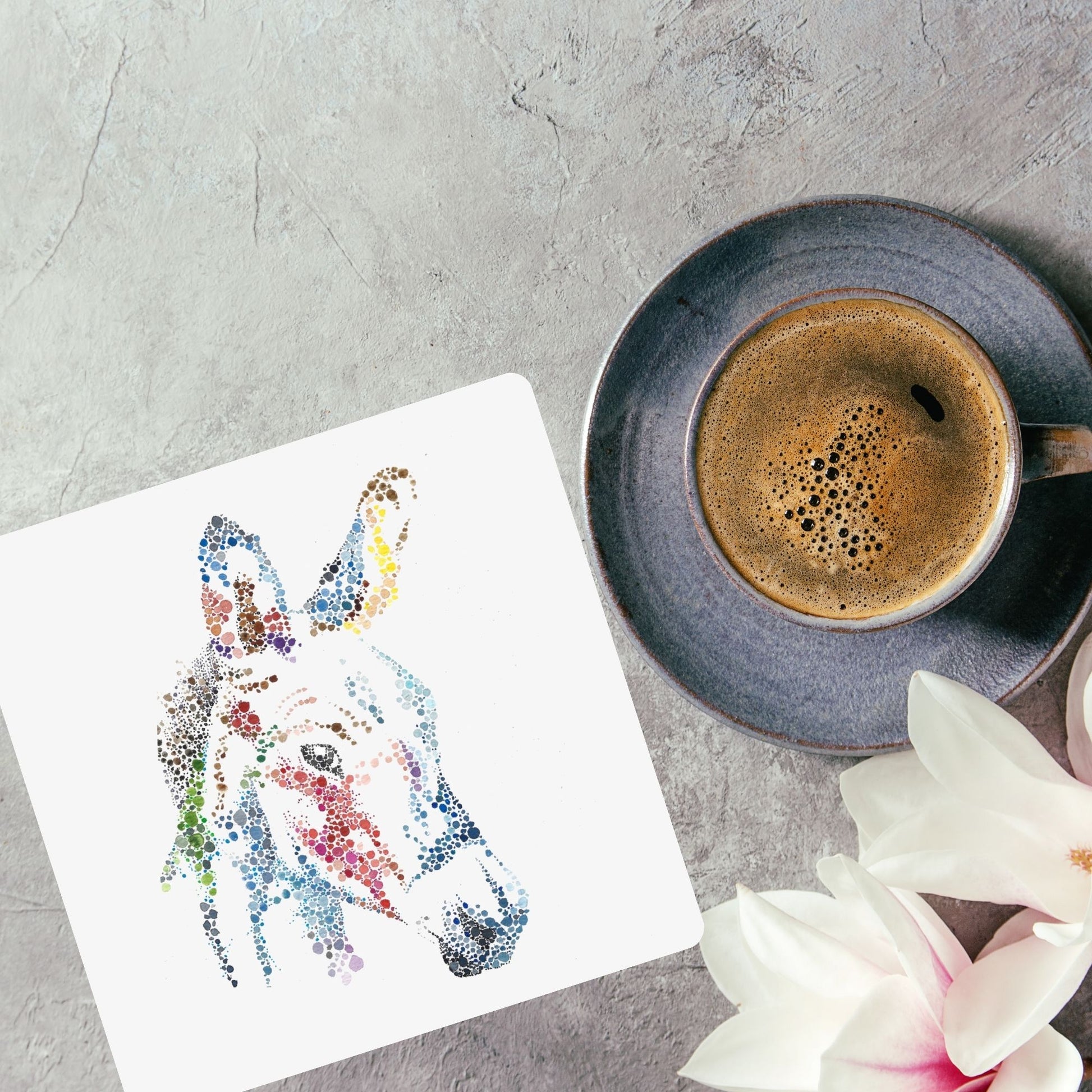 Elevate your home décor with the charming Watercolour Dot Donkey Coaster from Dots Allowed. This beautifully illustrated coaster features a delightful donkey design, meticulously crafted in the unique style of pointillism. Perfect for animal lovers and art enthusiasts, this coaster is a wonderful addition to any home.
